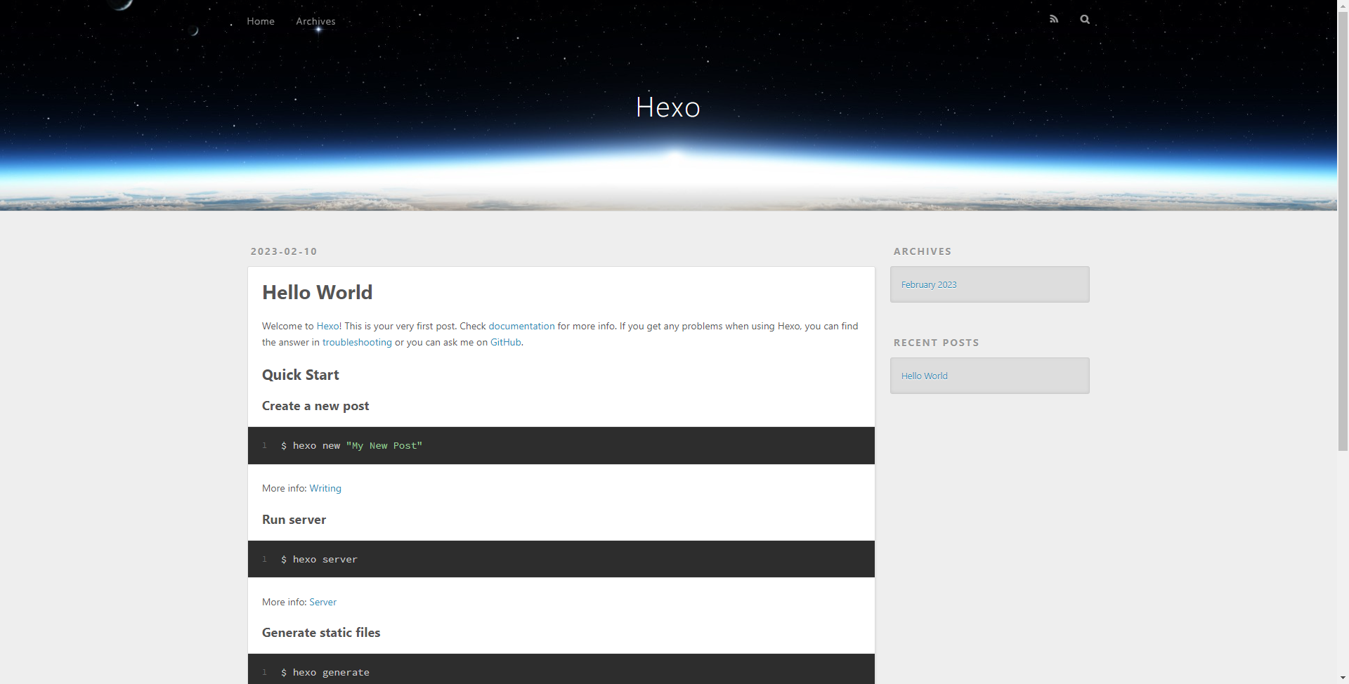 在终端中输入这行代码,Hexo 将会自行完成安装。